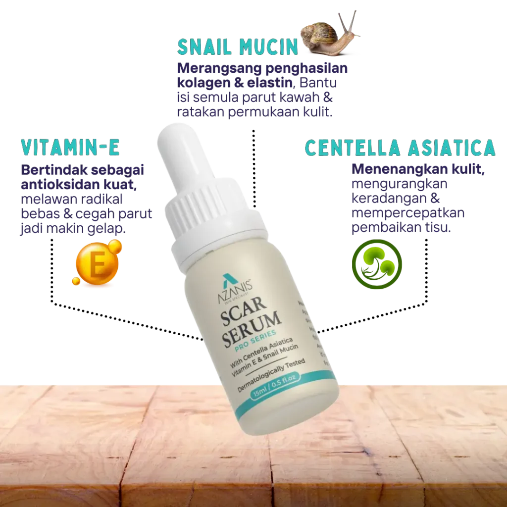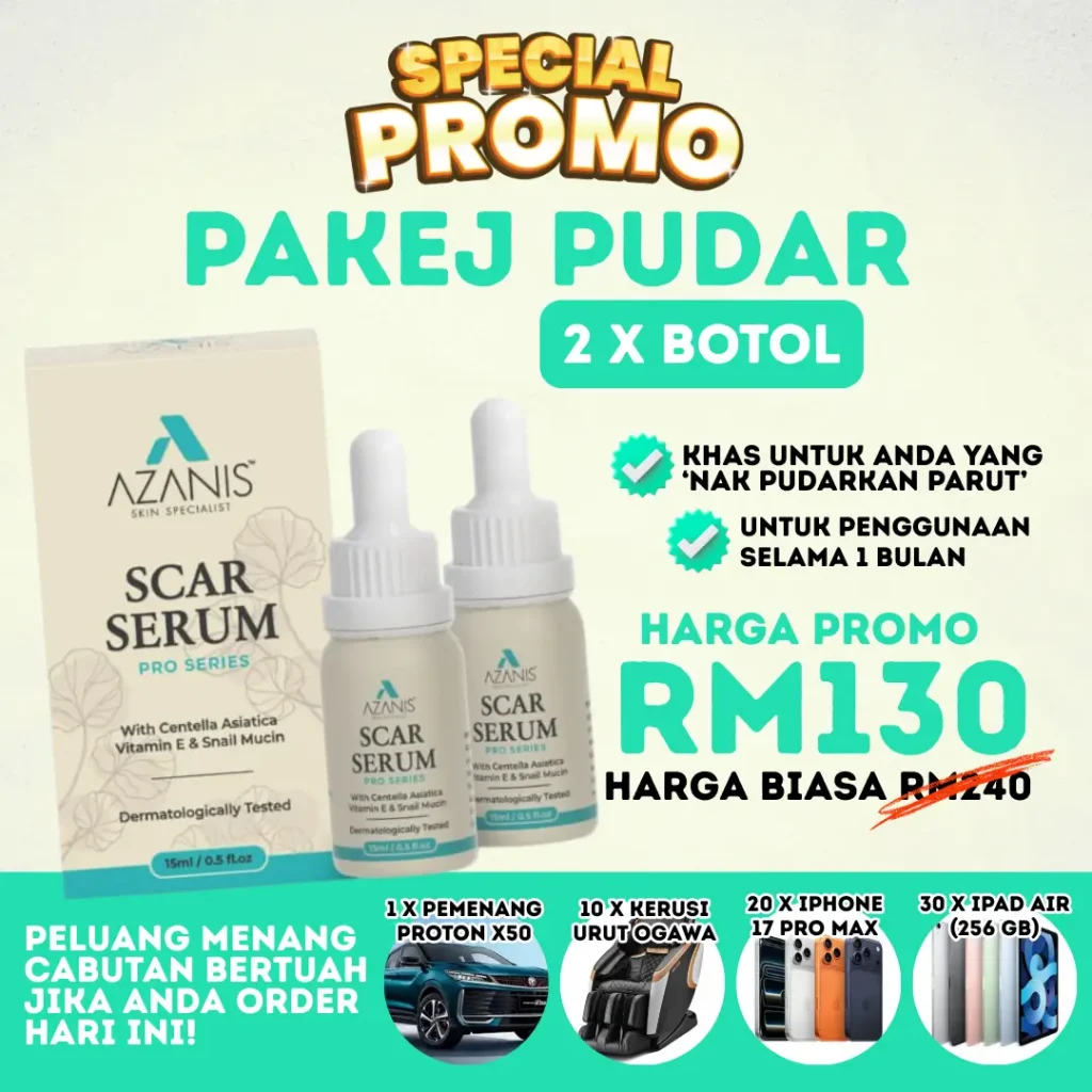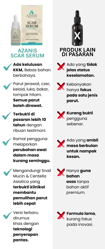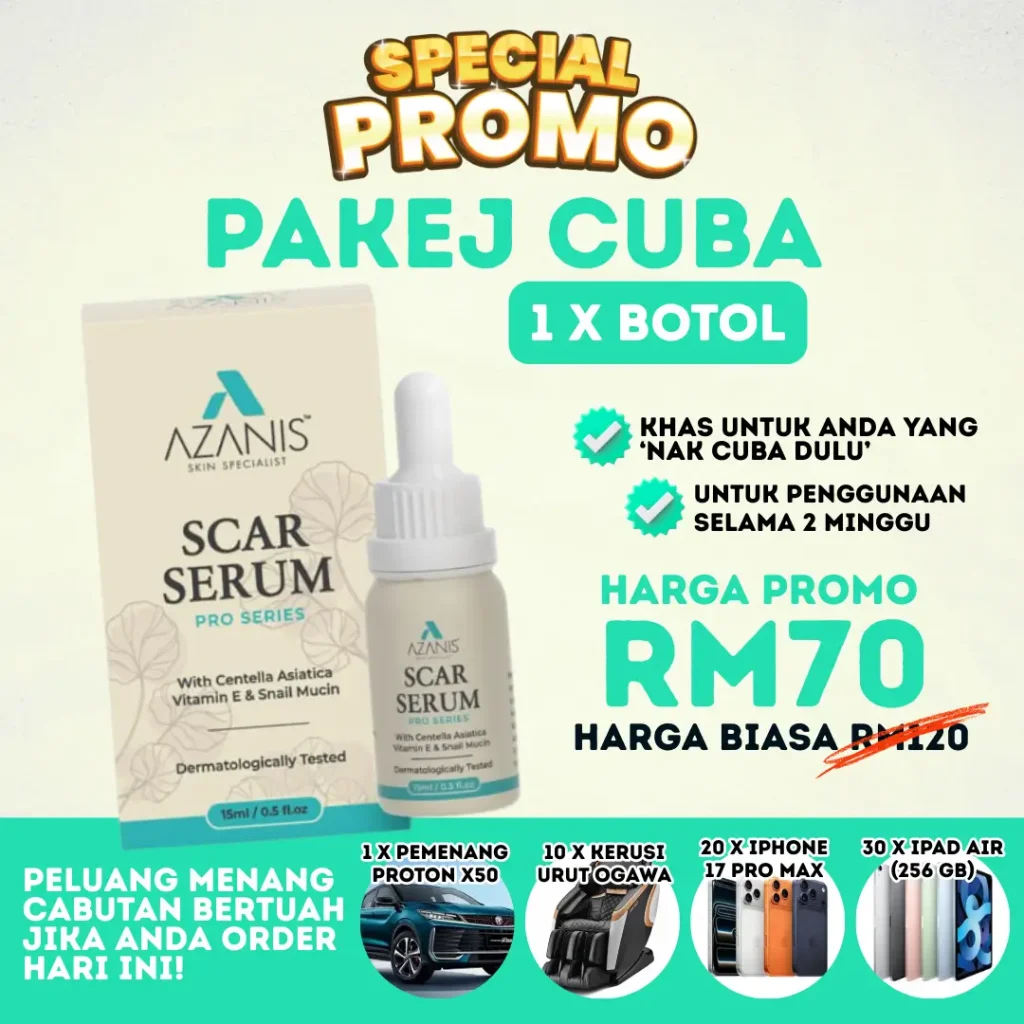 Pilih solusi yang terbukti selamat – Azanis Scar Serum dengan bahan semula jadi premium, kini disahkan selamat oleh KKM.